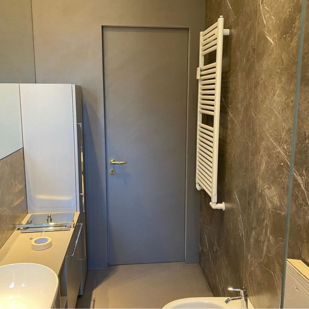 Le opere di finitura hanno visto la posa del parquet in tutti i locali ad eccezione del bagno, dove abbiamo invece scelto di utilizzare la resina sia per i pavimenti che per le pareti. Per i rivestimenti abbiamo posato delle lastre di grandi formati 120 X 240.