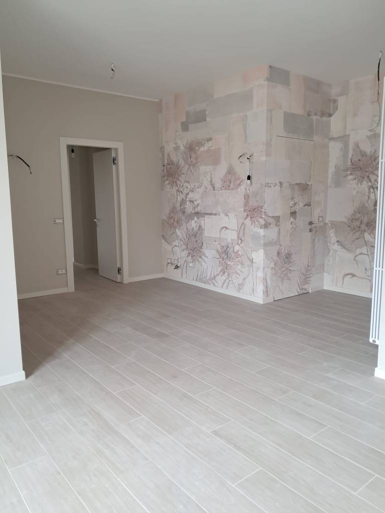 Il cliente, che ha scelto delle finiture sulle tonalità del beige, del grigio e del bianco, ha preferito utilizzare la carta da parati su alcune pareti del salone, per caratterizzare l’ambiente con un tocco di personalità.